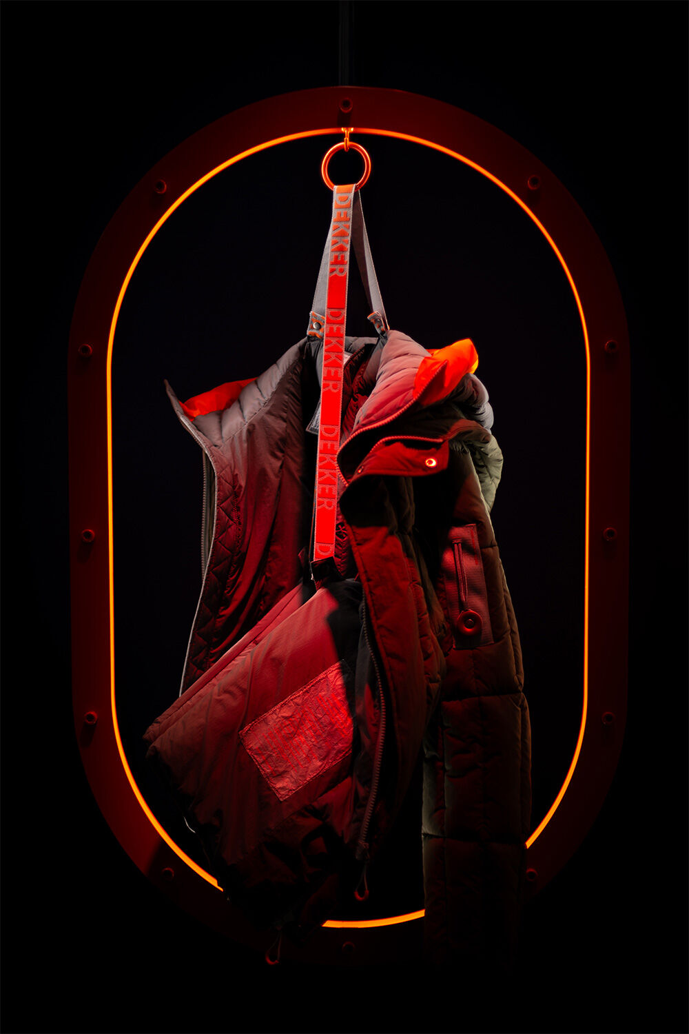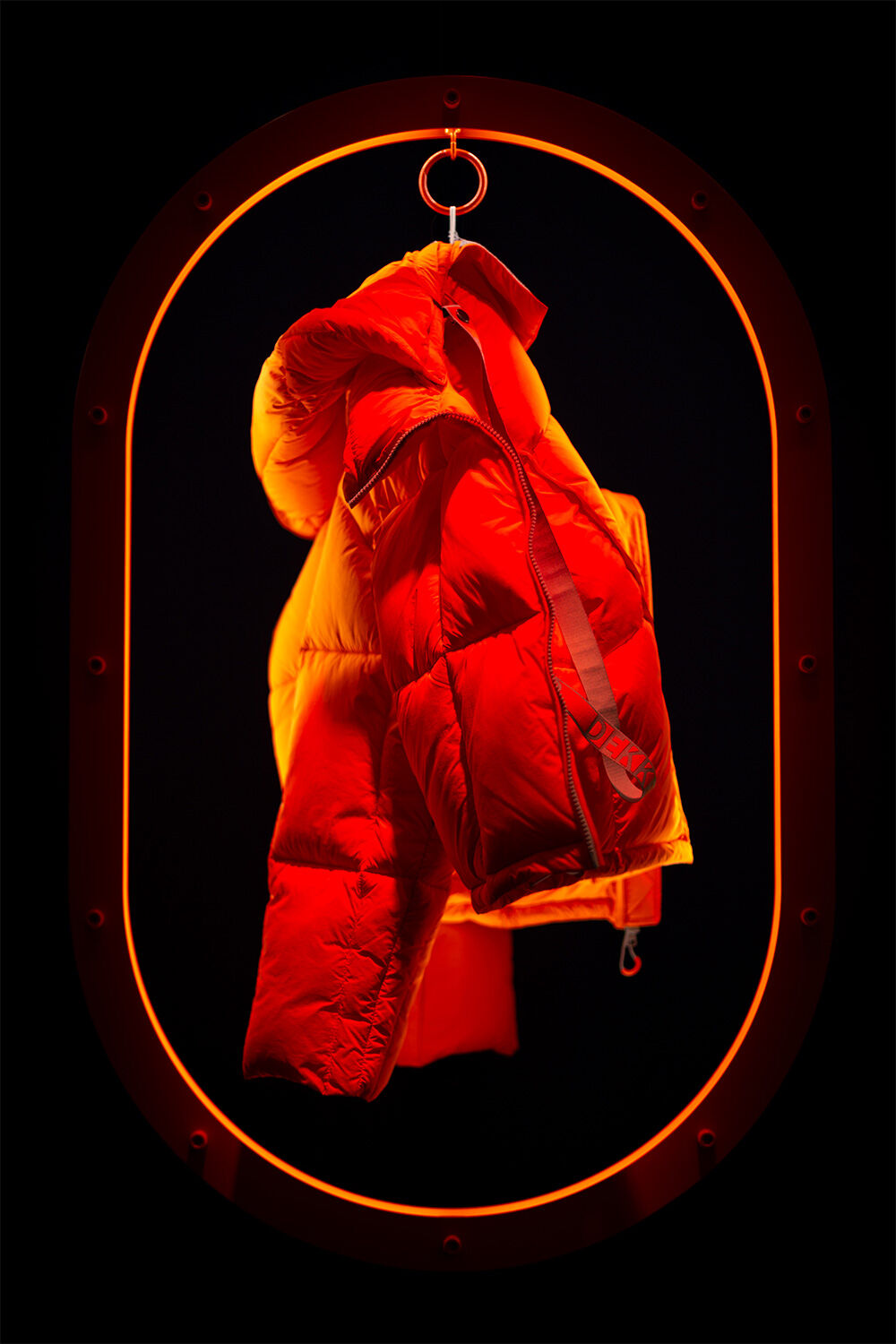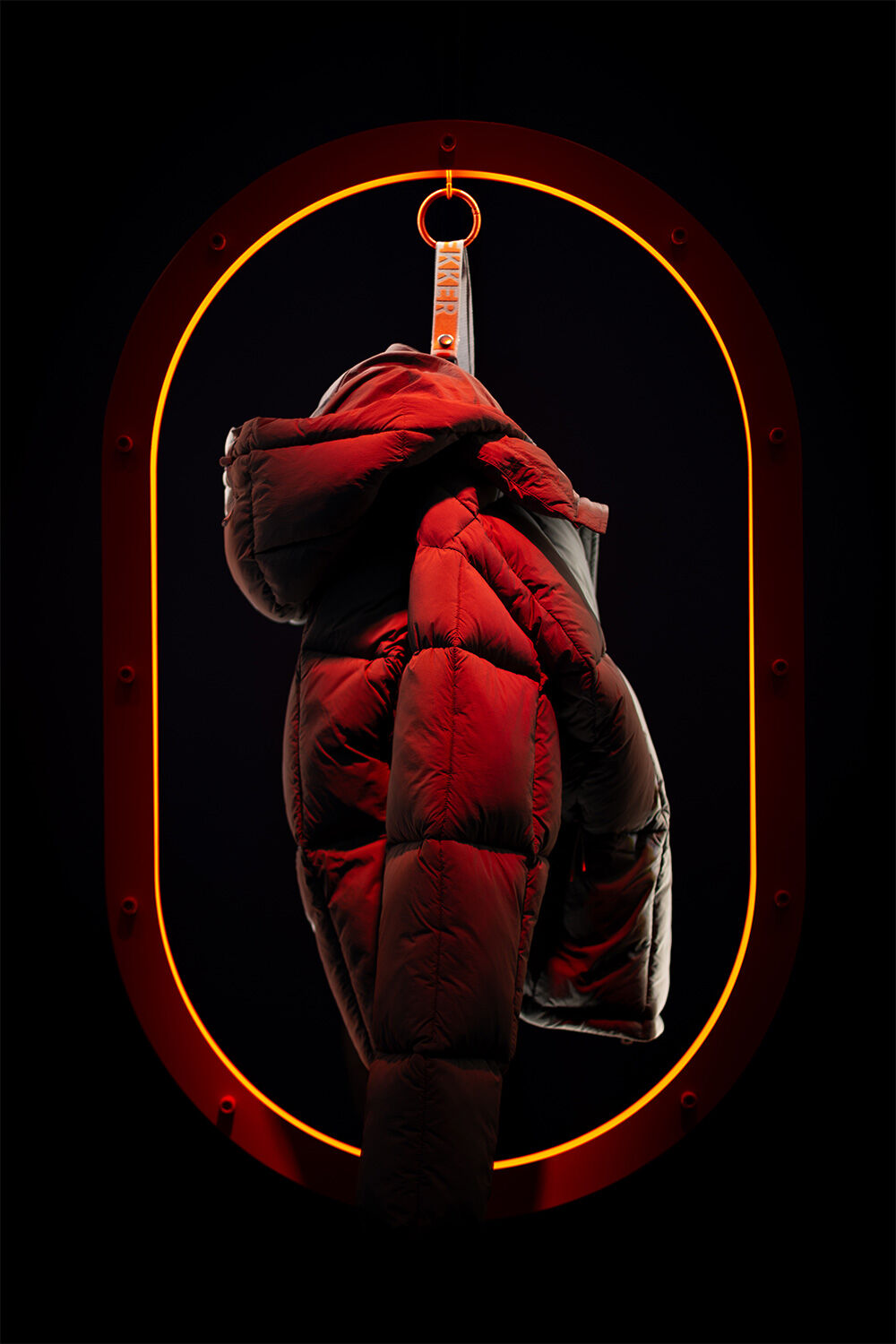 L’oblò del sottomarino diventa logo, lo scafo prende forma nella manica del capospalla: segni distintivi che raccontano l’identità del marchio.